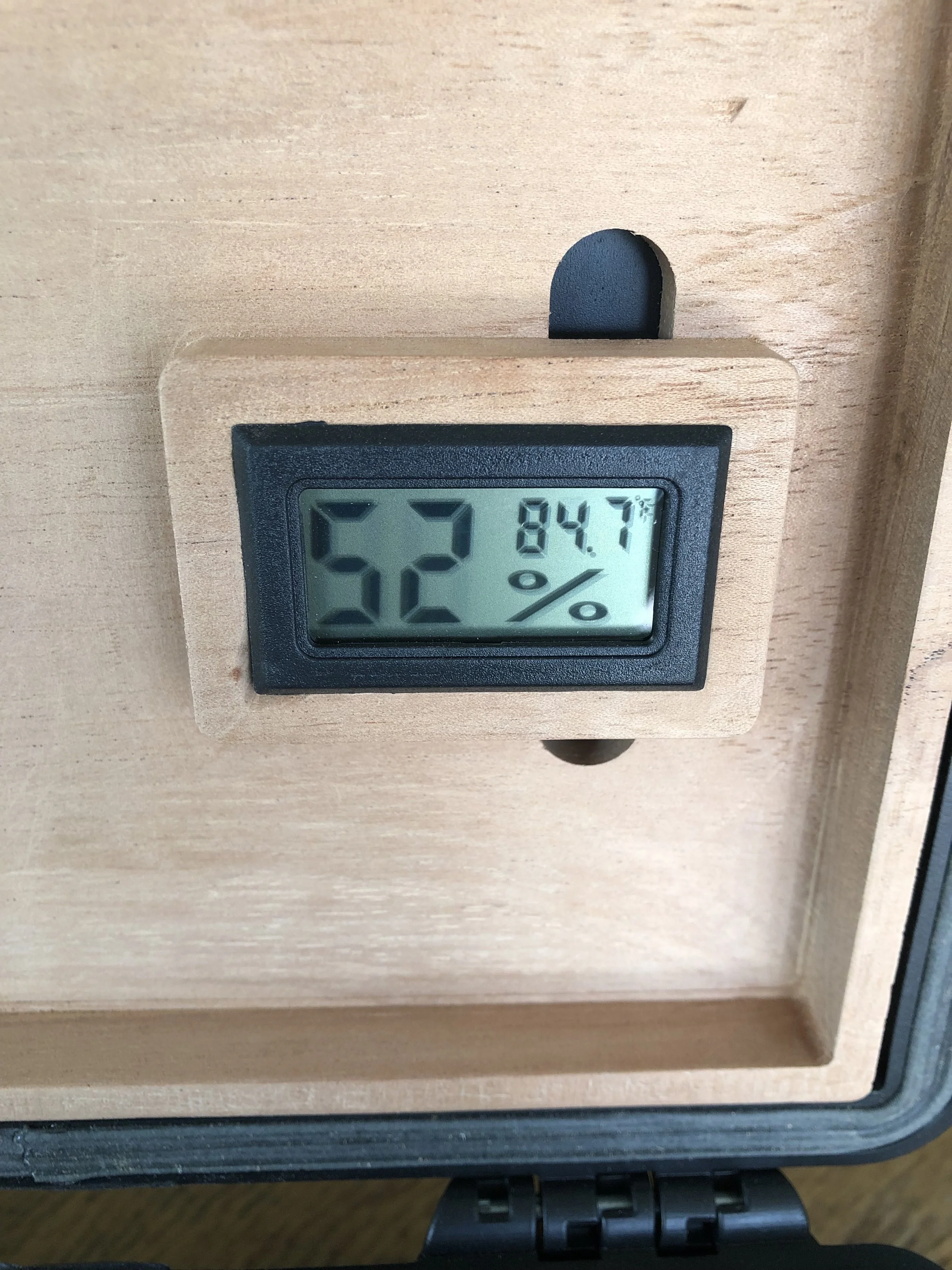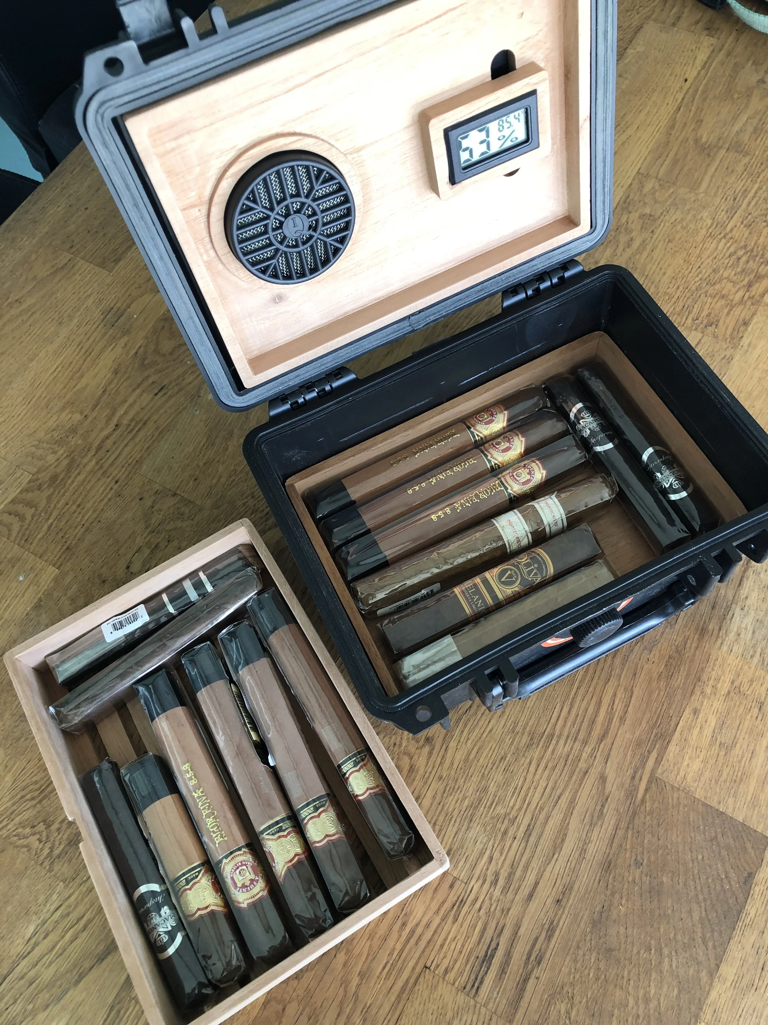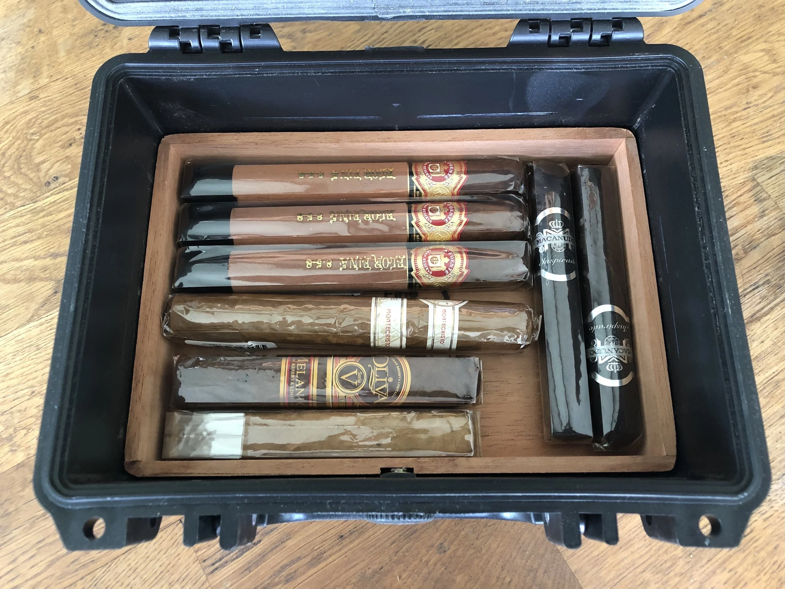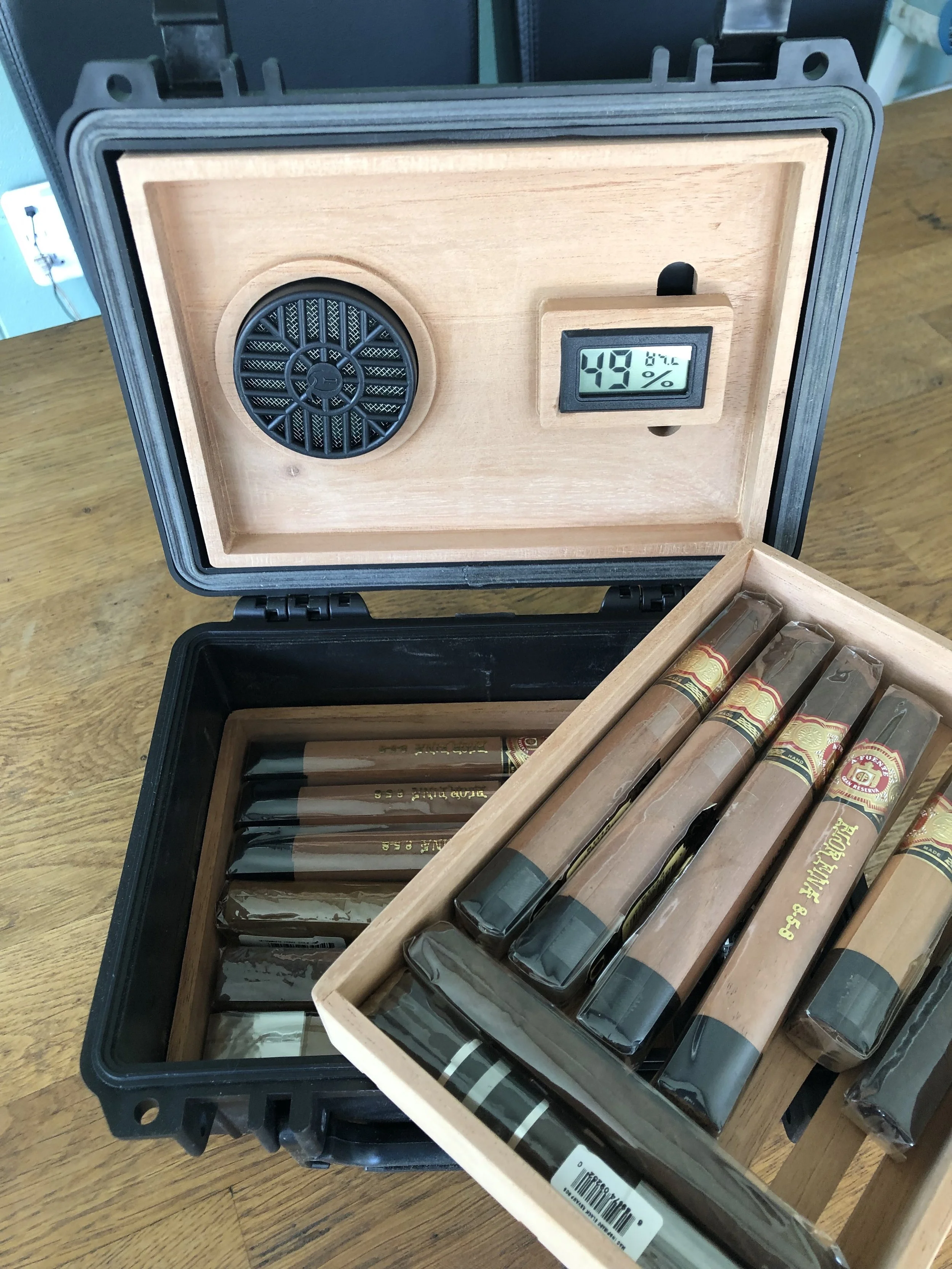 Shop › Ultimate Travel Humidor Image 1 of 7 Image 2 of 7 Image 3 of 7 Image 4 of 7 Image 5 of 7 Image 6 of 7 Image 7 of 7 Ultimate Travel Humidor from $138.50 The perfect way to travel your prized cigars. Personalized: Select Personalized Standard AJFWW logo brass plaque Custom engraved brass plaque Add To Cart Added! The perfect way to travel your prized cigars.